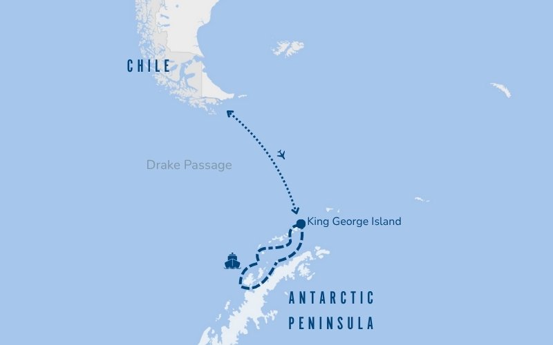 Fly across the notorious Drake Passage to King George Island where you board your ship and start your Antarctic expedition cruise. This is the most comfortable way to reach Antarctica, ideal if you want to see the highlights of the Antarctic Peninsula in a short period of time.