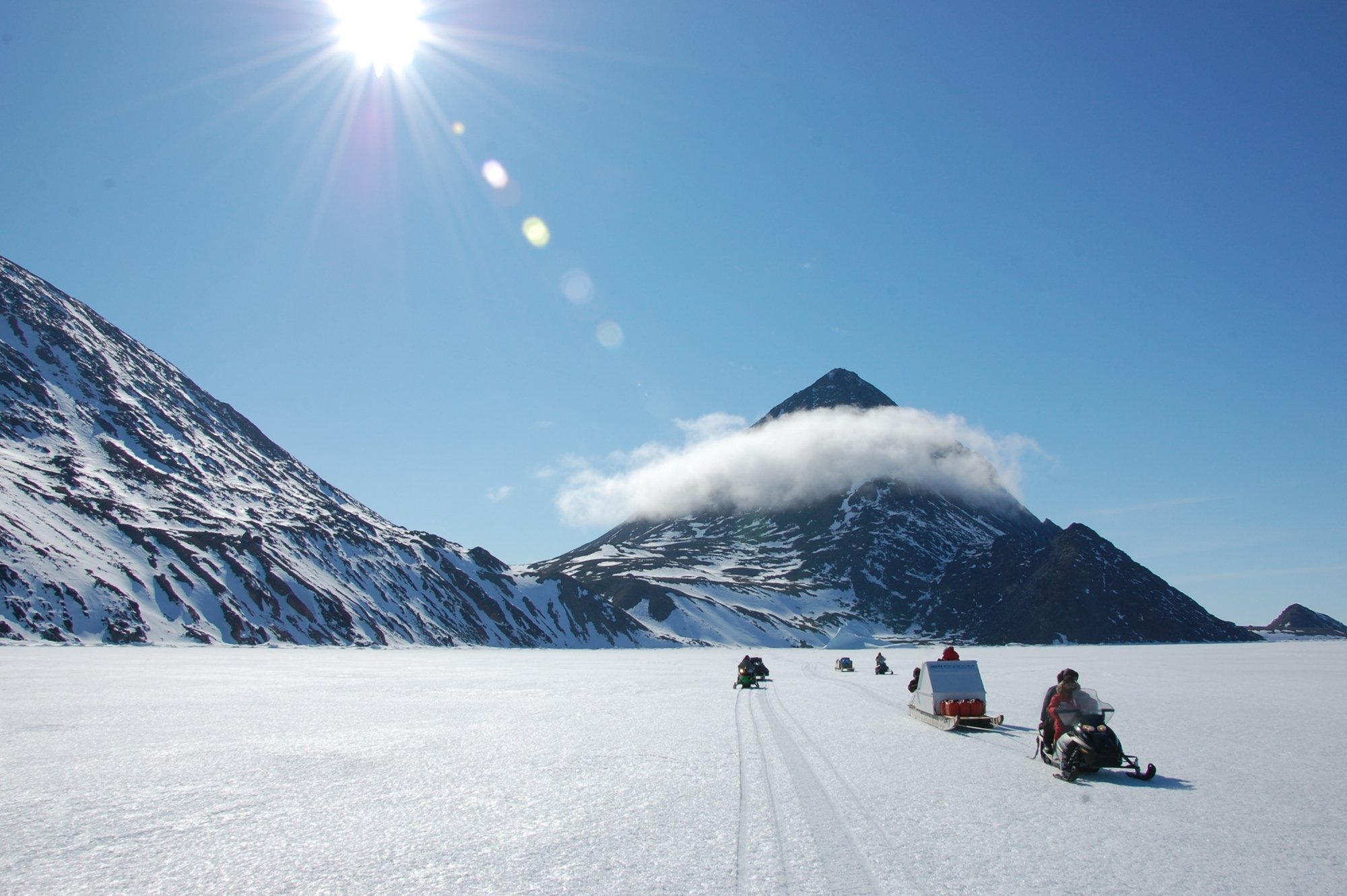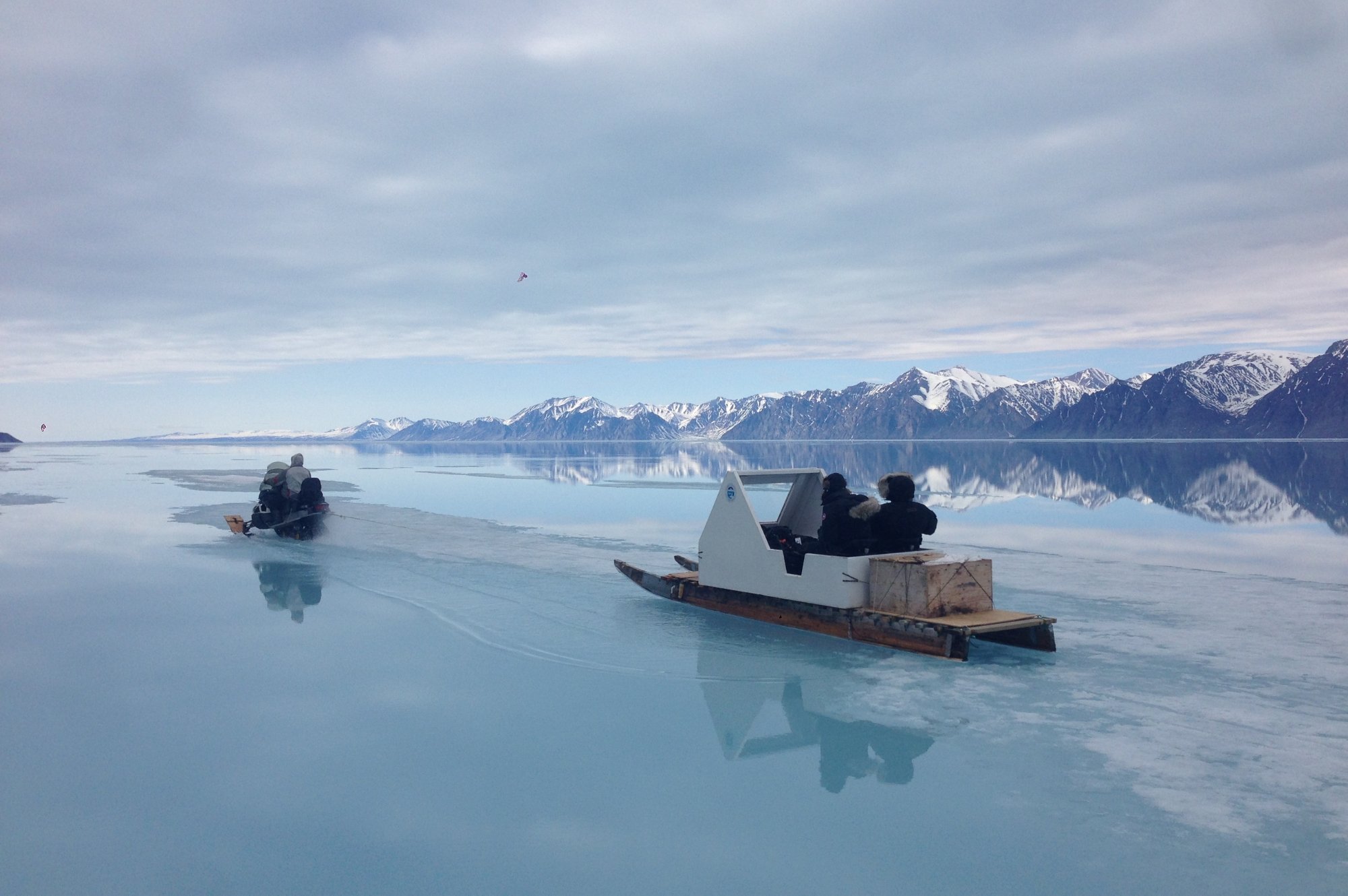 Traveling over the ice is done the traditional Arctic way by Inuit qamutik sleds pulled by snowmobiles. Each wooden sled carries two to four guests and is equipped with padded seats for comfort. The journey offers an authentic experience and stunning views across the frozen landscape.