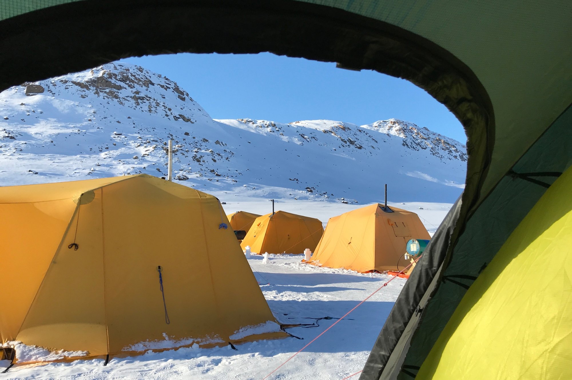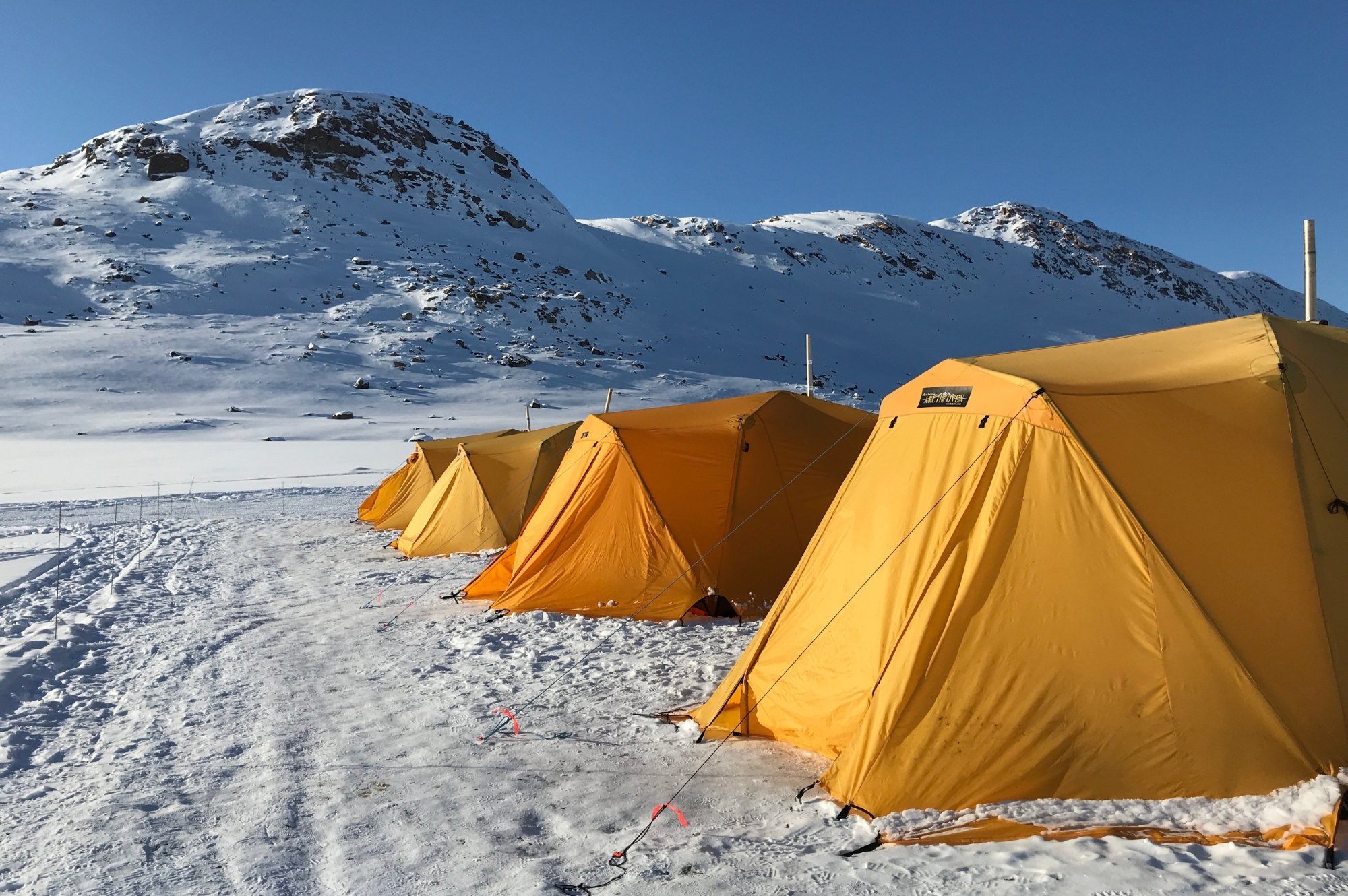 The camp is a cozy Tented Safari Camp set directly on the sea ice, offering an authentic Arctic experience with modern comfort. Spacious, heated tents accommodate two guests and include twin beds with duvets, pillows, and seating for daytime relaxation. Shared bathroom facilities are located in a heated tent with waterless toilets, hot-water sinks, and showers, plus essential toiletries.