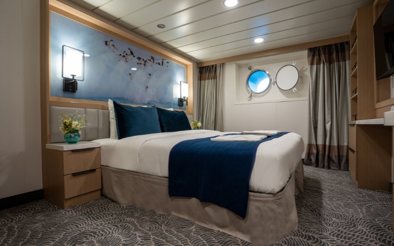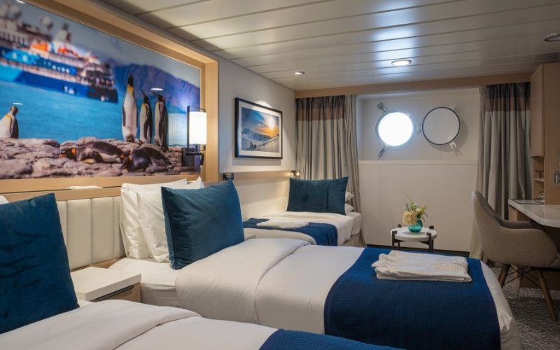 De standaard tweepersoonshutten met patrijspoort aan boord van de Ocean Victory zijn gunstig gelegen op dek 3 en 4, dicht bij de mudroom en de zodiac platforms. De hutten zijn perfect voor actieve ontdekkingsreizigers die een comfortabele basis wensen tijdens hun expedities. De hutten hebben een tweepersoonsbed of twee aparte bedden en een badkamer.