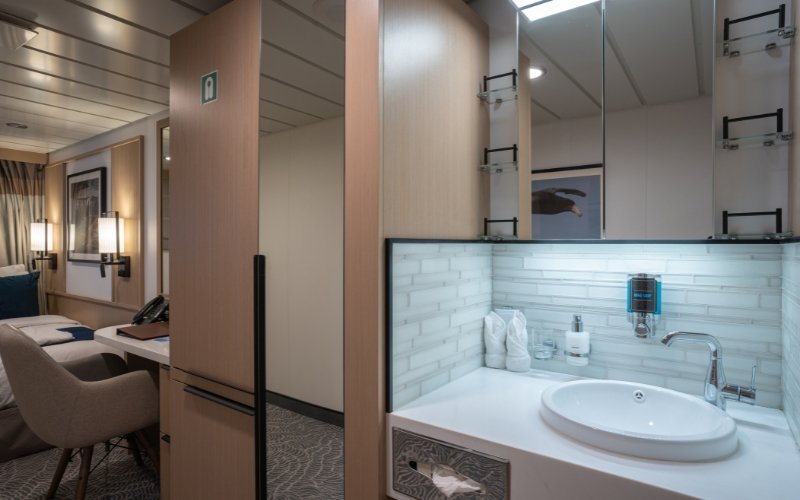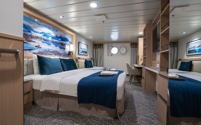 De driepersoonshutten met patrijspoorten bevinden zich op dek 3. Ze liggen dicht bij de mudroom en de zodiac boarding...