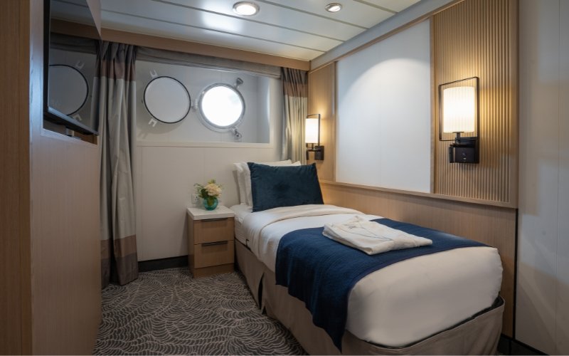 De eenpersoonshutten zijn beschikbaar zonder toeslag. Deze bevinden zich op dek 3, een handige locatie dicht bij de mudroom en de zodiacs platforms. Alle eenpersoonshutten hebben patrijspoorten en een eigen badkamer.