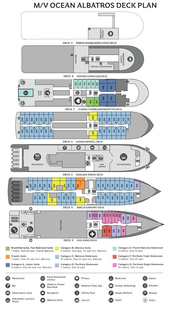 Alle huttypes aan boord van de Ocean Albatros zijn voorzien van een kluisje, televisie, koelkast, diverse 230W stroom- en USB-stopcontacten. In de badkamer vind je badjassen en -slippers, toiletartikelen (body wash, lotion, shampoo) en een haardroger.