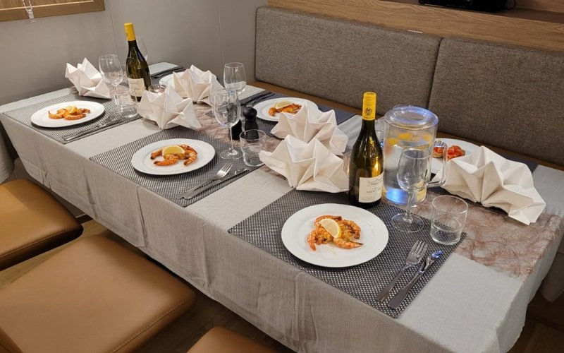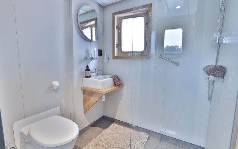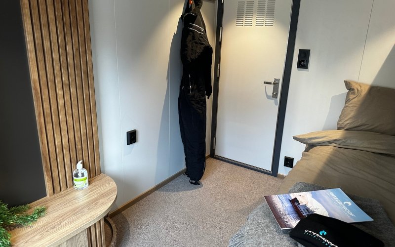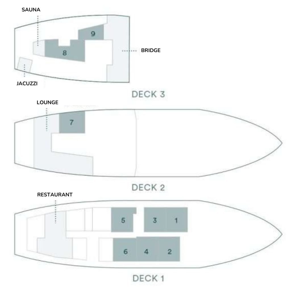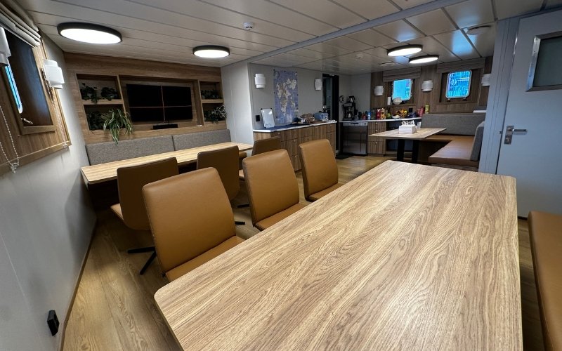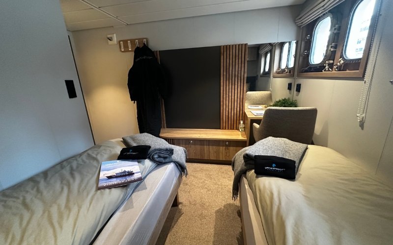 Aan boord vind je 6 tweepersoonshutten en 2 eenpersoonshutten, die elk een eigen badkamer hebben. Voor degenen die zich willen opwarmen na een lange dag in de kou staan de jacuzzi en sauna tot hun beschikking.
