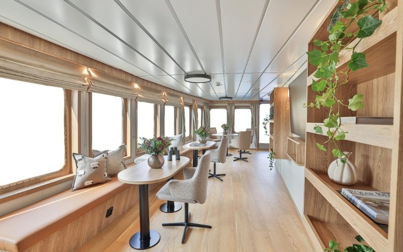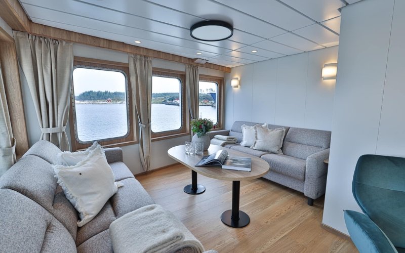 Met haar nieuwe en lichte Scandinavische designinterieur biedt Vikingfjord veel comfort op een klein schip. De gezellige observatielounge op dek 2, met grote ramen aan de achterkant, is het hart van het schip. Hier vind je tafels, stoelen en comfortabele zitjes om in alle rust van het landschap te genieten.