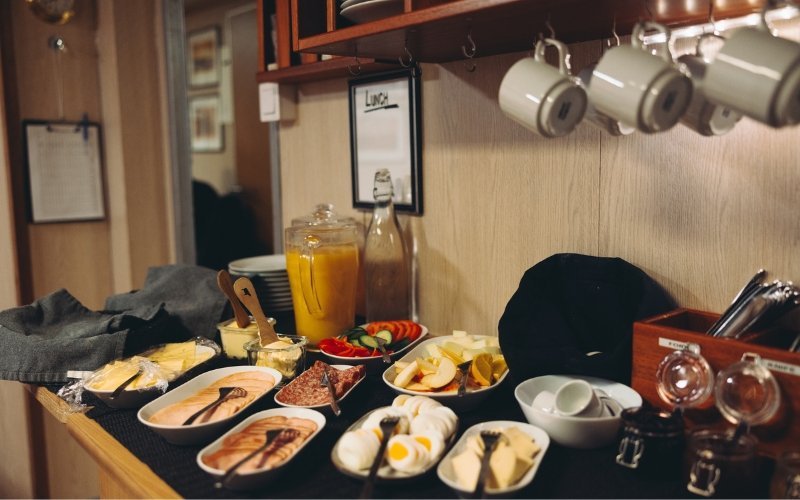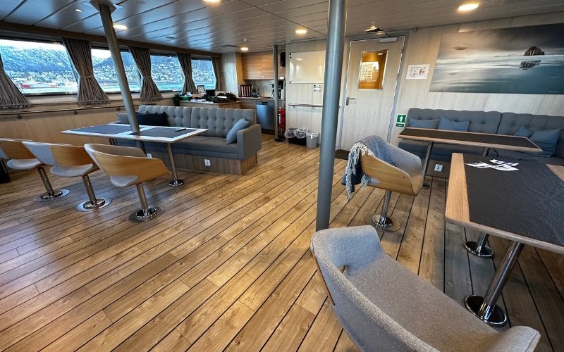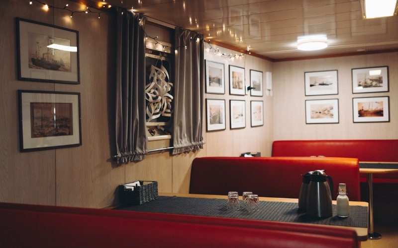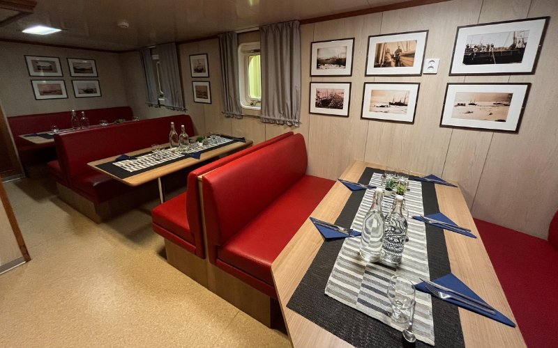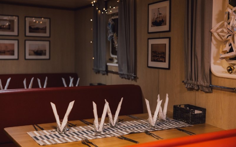 In ons gezellige restaurant op het benedendek kun je genieten van ontbijt, lunch en diner. Van versgebakken brood in de ochtend tot een stevige maaltijd in de avond, de chef zorgt ervoor dat je genoeg energie hebt voor spannende dagen in het Noordpoolgebied.