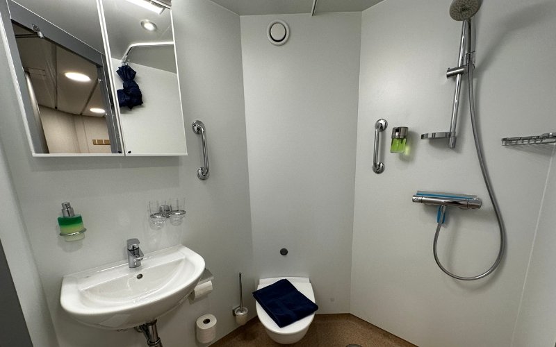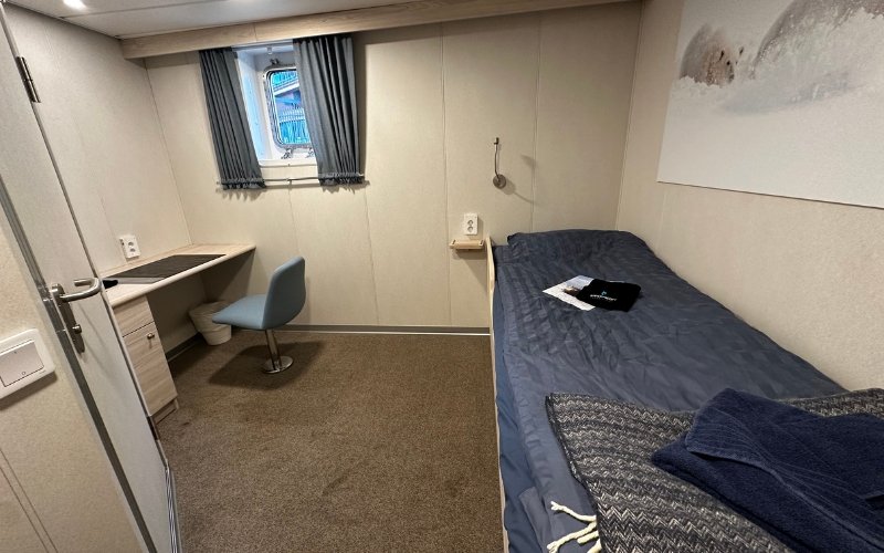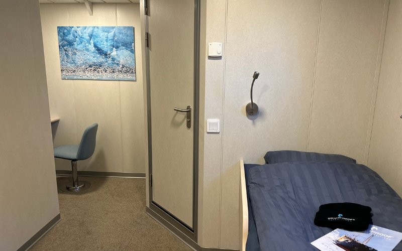 Aan boord van de Virgo hebben we 6 eenpersoonshutten. Eén bevindt zich op het bovendek, alle anderen op het bovendek. Elke hut heeft een eenpersoonsbed, een eigen badkamer, bergruimte, een bureau met stoel en een patrijspoort.