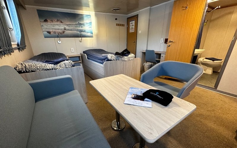 Expeditieschip Virgo biedt plaats aan maximaal 12 gasten in 9 hutten. Alle hutten hebben een fris en licht Scandinavisch interieur. Op het bovendek bevinden zich 2 ruime Superior Suites, een Twin Cabin en een Single Cabin. Op het benedendek vind je vijf comfortabele Single Cabins. Elke hut heeft een eigen badkamer, een bureau, opbergruimte en ten minste één patrijspoort.