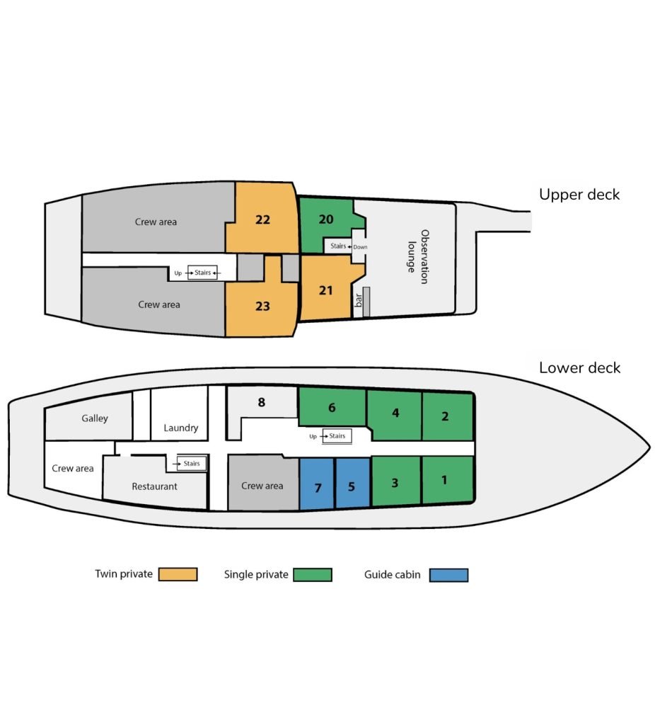 Aan boord van de Virgo hebben we 6 eenpersoonshutten. Eén bevindt zich op het bovendek, alle anderen op het bovendek...
