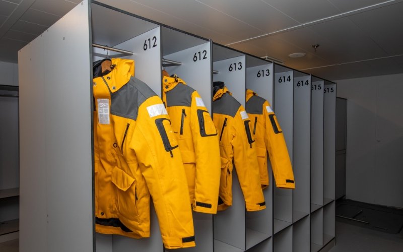 Op dek 3 bevindt zich de ‘Mudroom’, waar elke gast een eigen opslagruimte heeft waar je je natte spullen ...