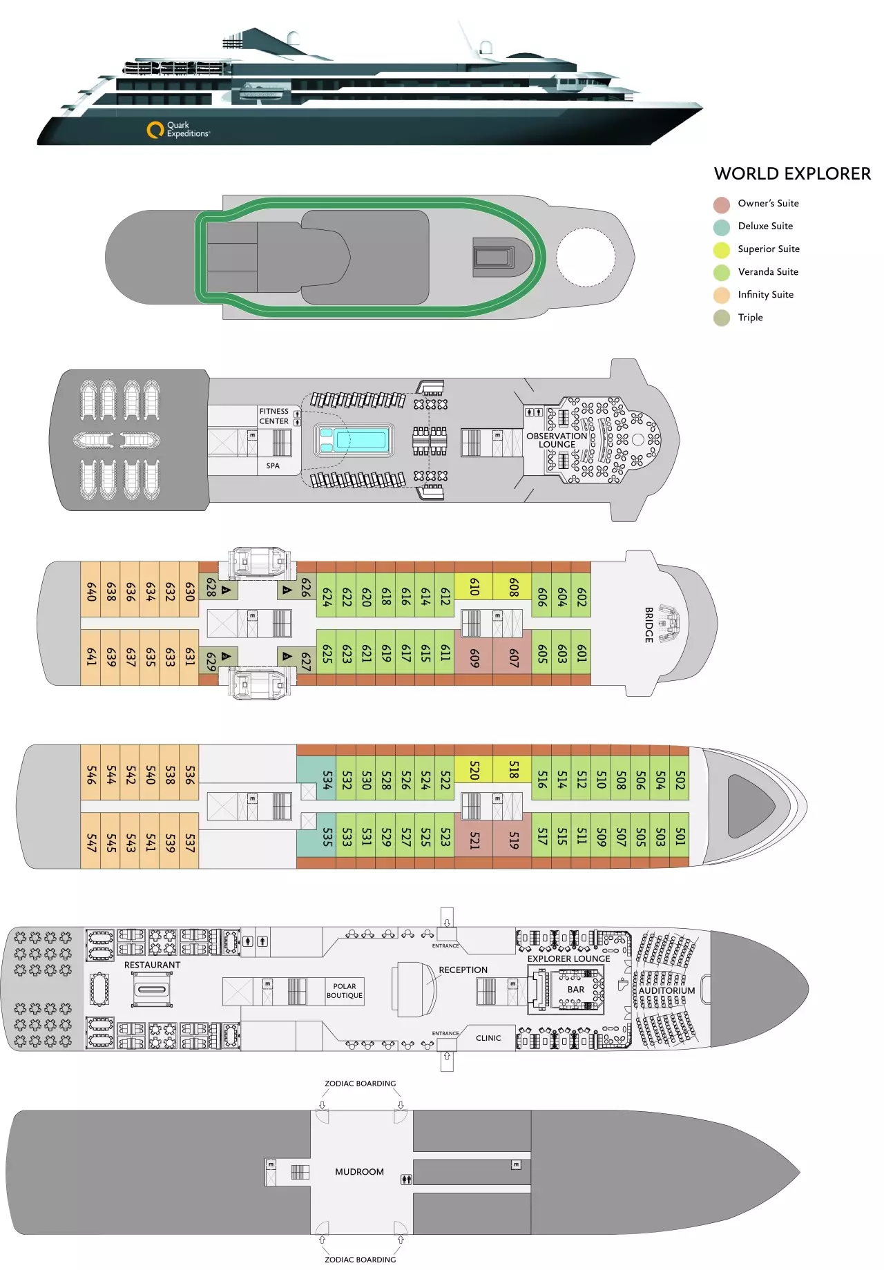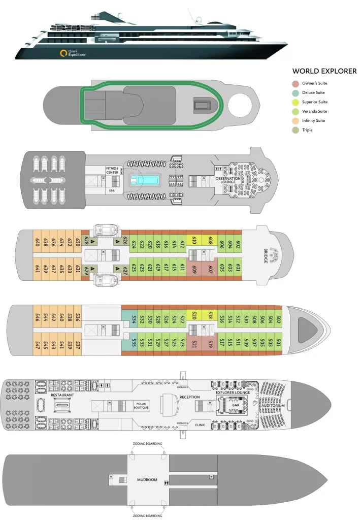 Op dek 3 bevindt zich de ‘Mudroom’, waar elke gast een eigen opslagruimte heeft waar je je natte spullen (zoals jassen, mutsen en handschoenen) kunt laten drogen na een activiteit buiten het schip, zoals zodiac excursies en landingen aan wal. De strategische locatie naast de zodiac inschepingsplaatsen zorgt voor een gemakkelijke toegang.