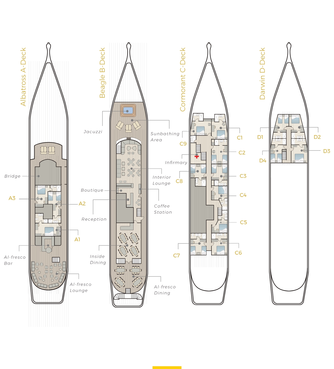 Located on the Cormorant and Darwin decks are the double cabins. Ranging between 13-18 sq meters in size, the double ...