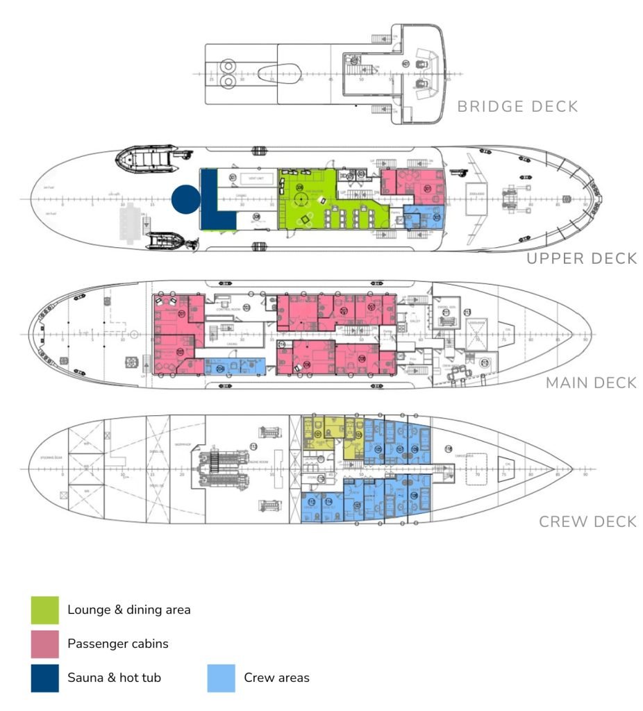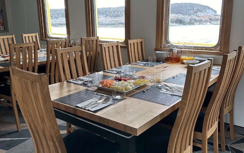The ship underwent a complete renovation in 2021, transforming it into a boutique yacht that offers unparalleled comfort and style. Guests can relax in the panoramic hot tub or enjoy the sauna while soaking in breathtaking views of the surrounding scenery. The bright and welcoming lounge serves as the heart of the ship, providing a perfect space to unwind after a day of exploration and enjoy a hearty meal.