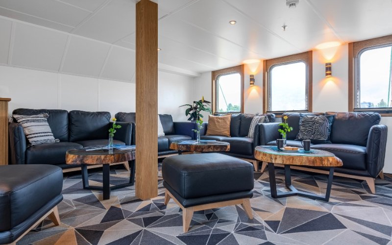 The open-plan lounge and dining area, located on the upper deck, is a welcoming space with expansive windows that flood the room with natural light. Its modern Scandinavian design creates a warm and inviting atmosphere, making it the heart of the ship. This is where you’ll come together for briefings and lectures or relax and share stories with your fellow passengers.