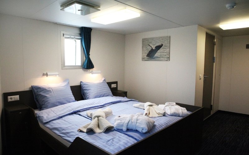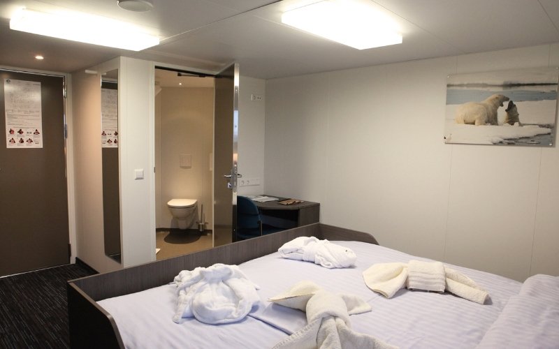 The Superior Suites are the most spacious cabins on board Ortelius and are located on deck 5. They provide you with a double bed, 1 single (sofa) bed, private shower & toilet, desk & chair, a TV, refrigerator, coffee & tea maker, hair dryer, ample storage space and at least 2 windows.