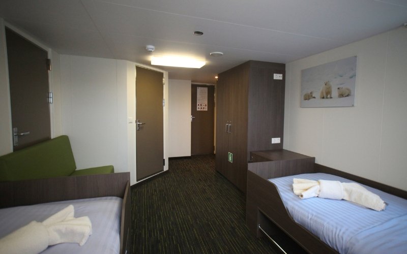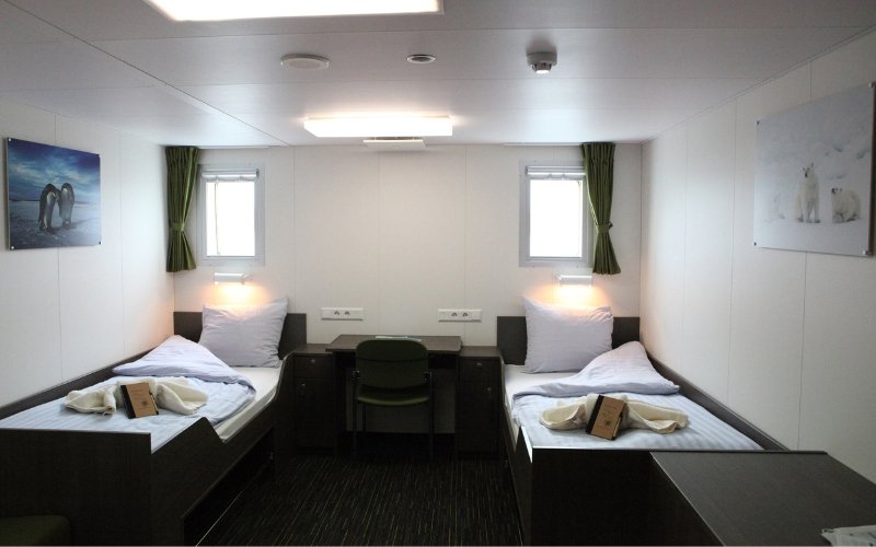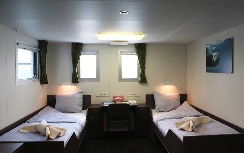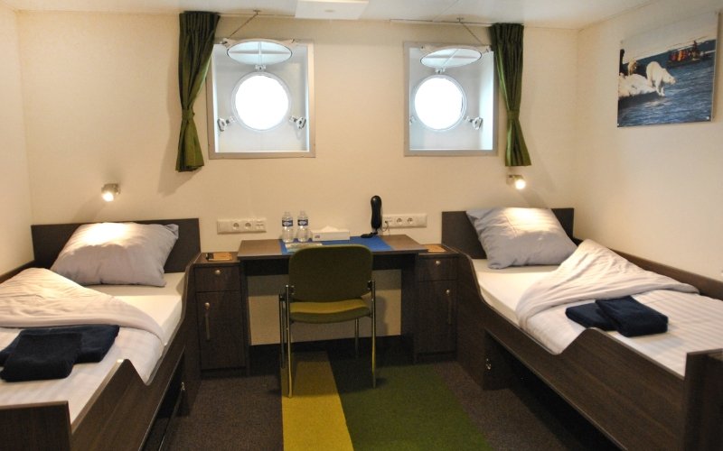 The Twin Window cabins are also located on deck 5. The cabins have 2 windows, 2 single beds, a private shower & toilet, desk & chair, small sofa, hairdryer and ample storage space.
