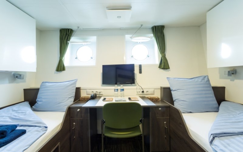 The Quadruple cabins are the same as the Triple cabins. These are located on deck 3 and have 2 porthole windows. You will find 2 bunk beds, a private shower & toilet, desk & chair, hairdryer and ample storage space.