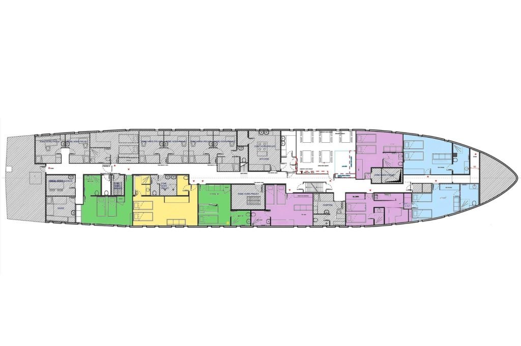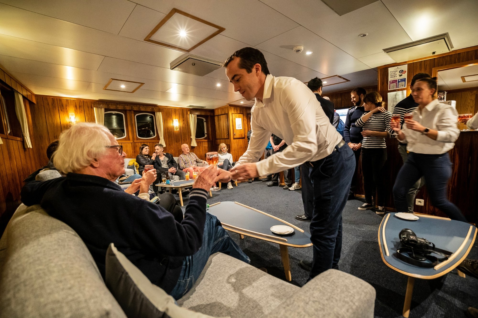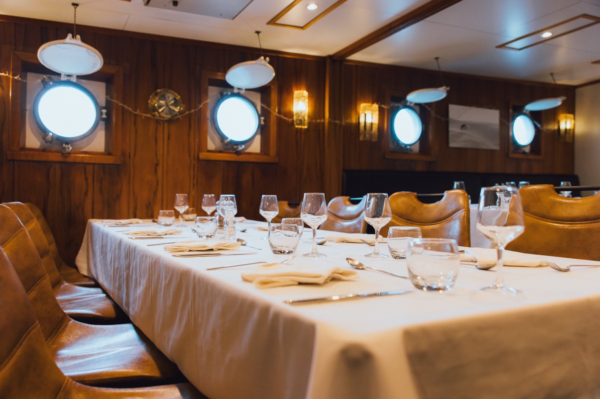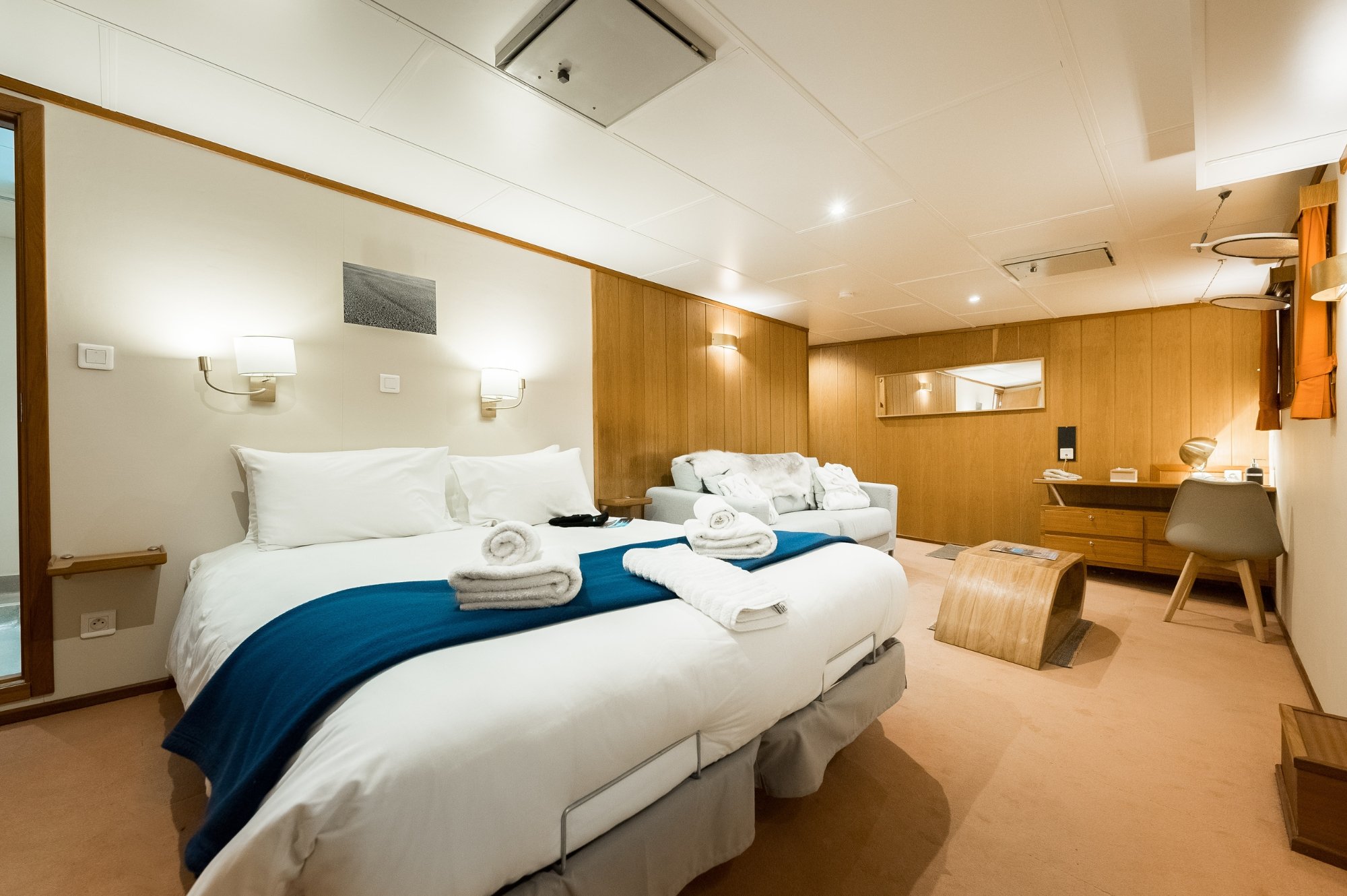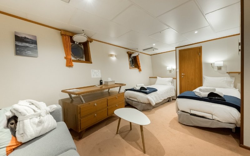 In total, there are 8 spacious twin suites on board, offering room for a maximum of 16 persons. Single travellers can book a shared cabin on request. The suites are situated on the lower deck and all have at least 2 porthole windows. The rooms are spacious and each has their own comfortable bathroom with shower. You’ll also find a hair dryer, bathrobes and bathroom products.