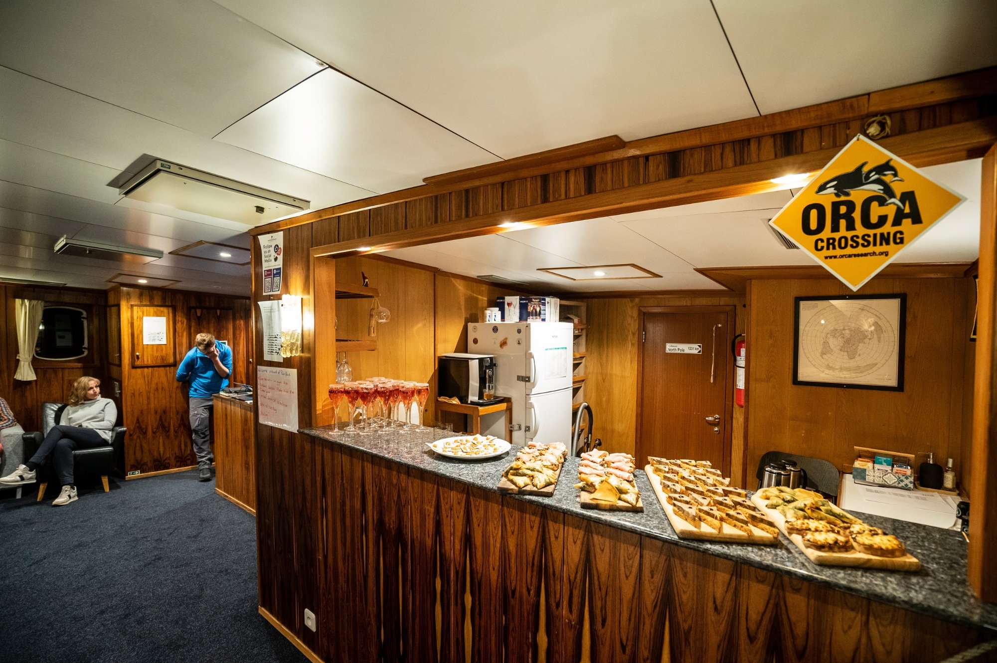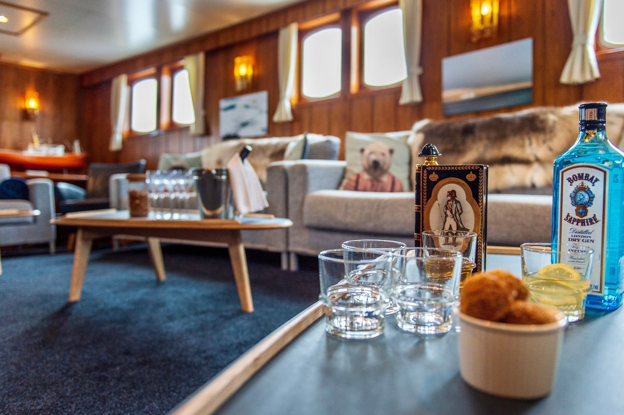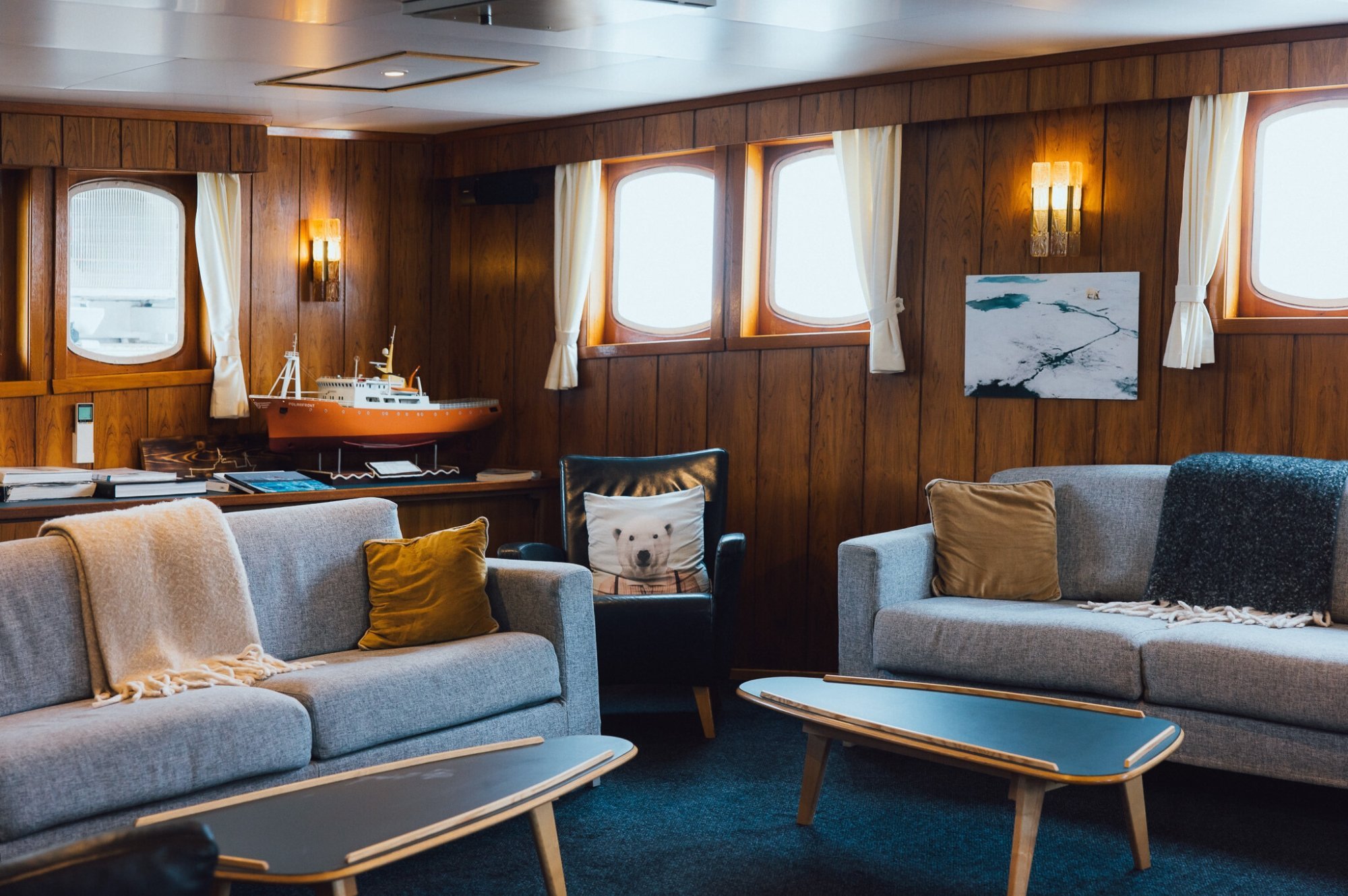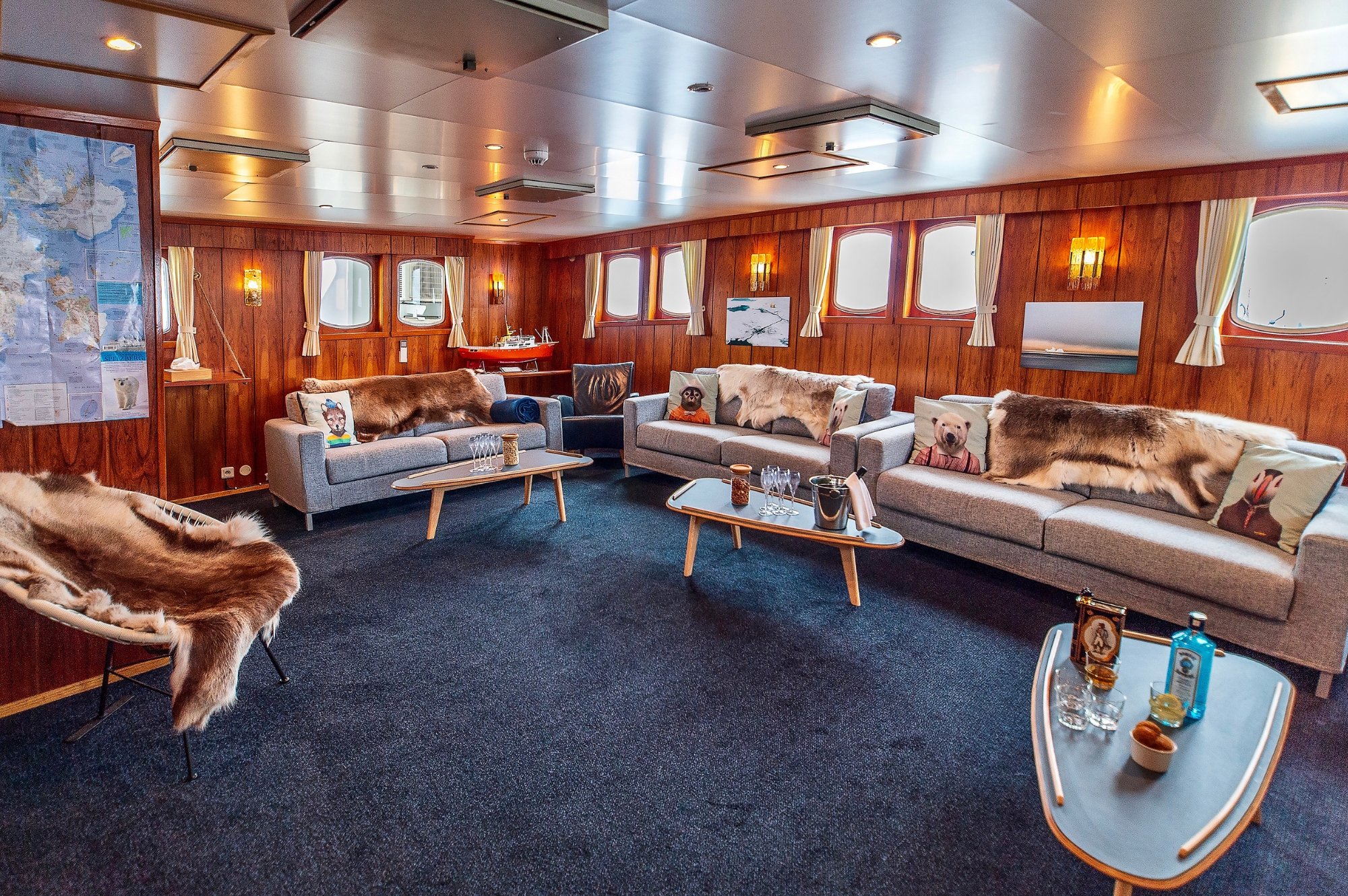 The lounge is our central meeting place on board Polarfront. This is where you’ll attend lectures, enjoy an afternoon snack, or catch up with your fellow expeditioners during the evening. Don’t hesitate to ask our crew if you’re looking for your favorite drink or cocktail.